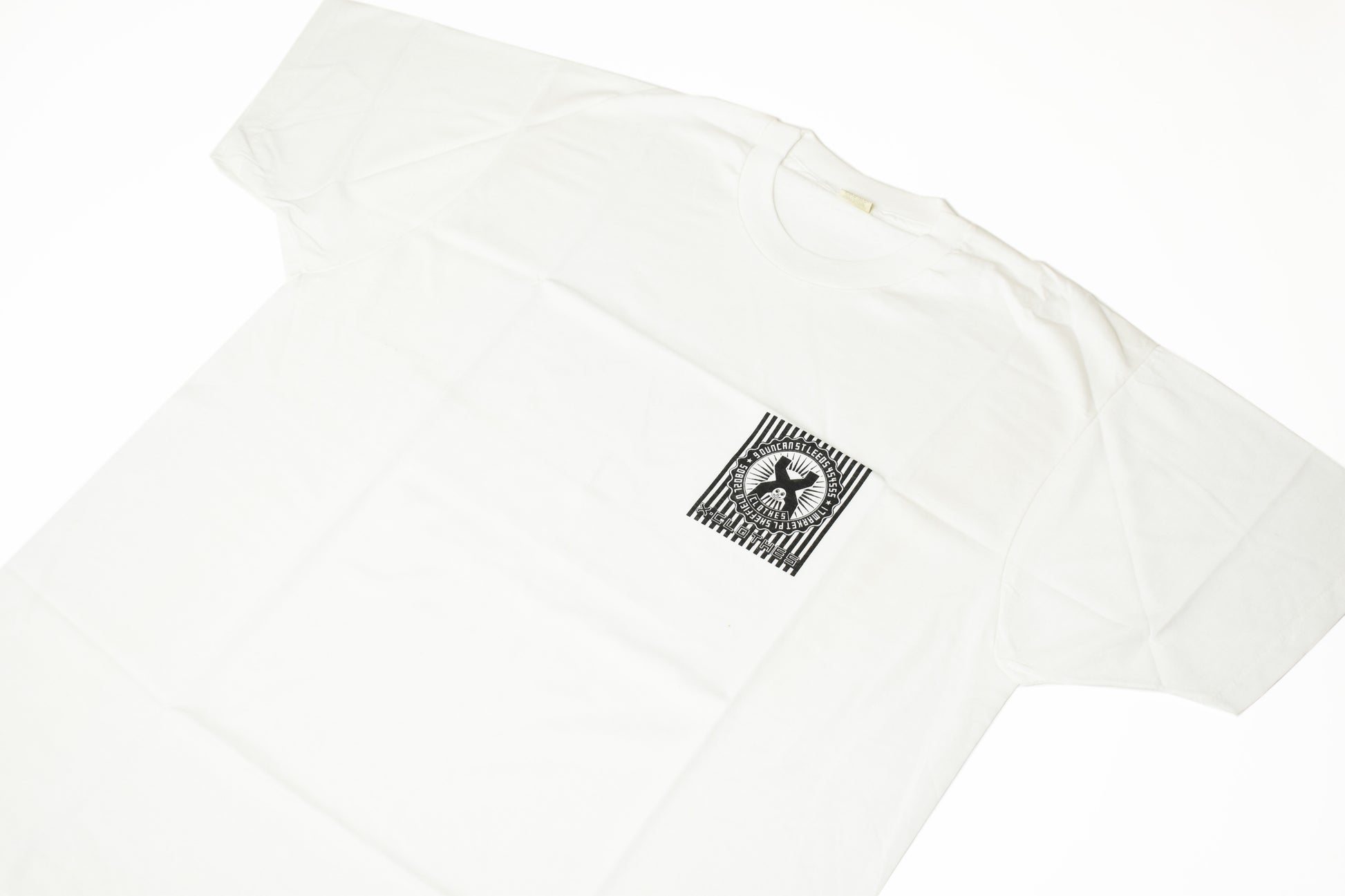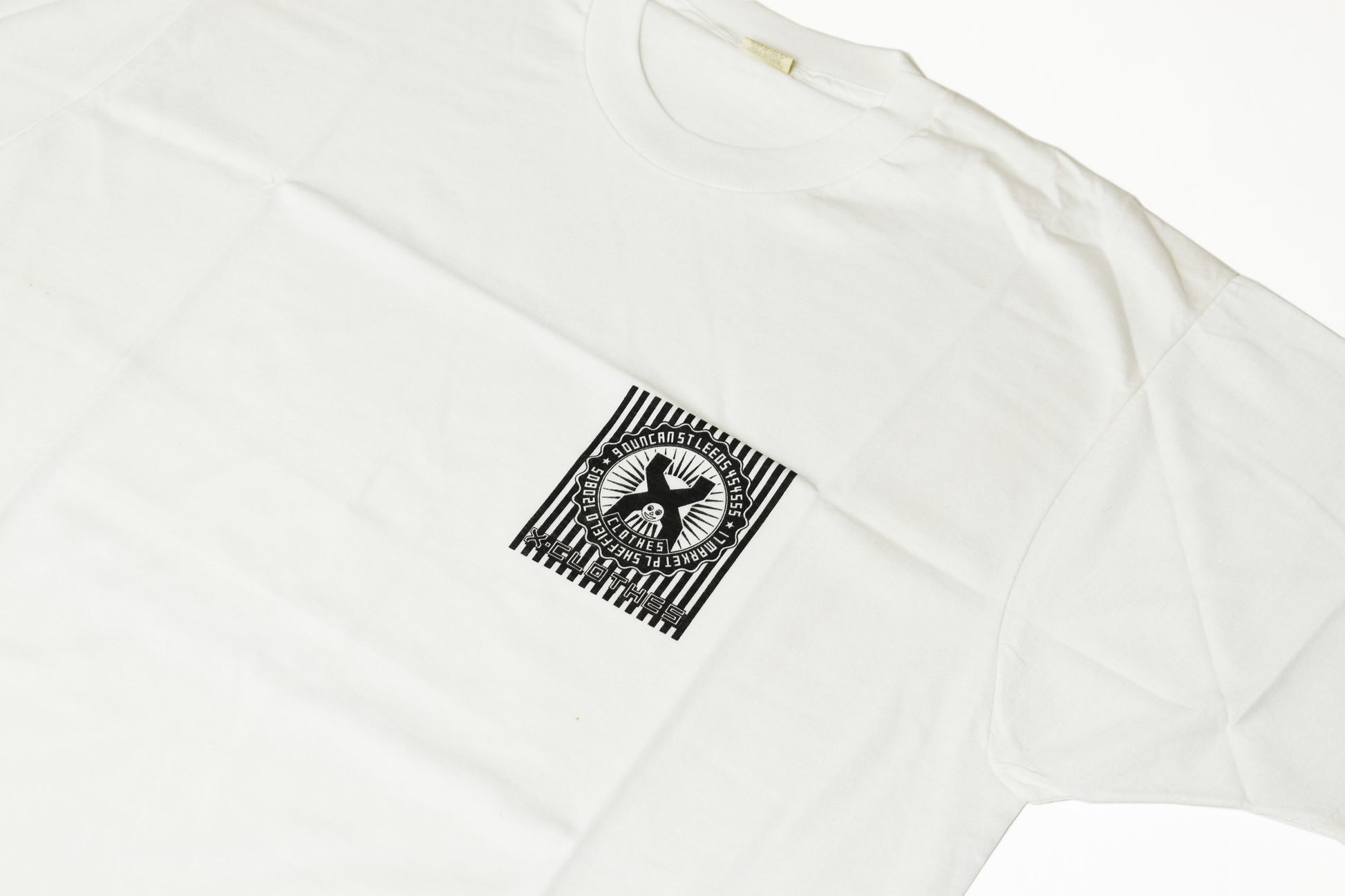 X Clothes printed a bunch of one colour ‘inexpensive’ promo tees primarily as giveaways to accompany big orders / larger pieces in the store, or to people on the Leeds scene at the time.
