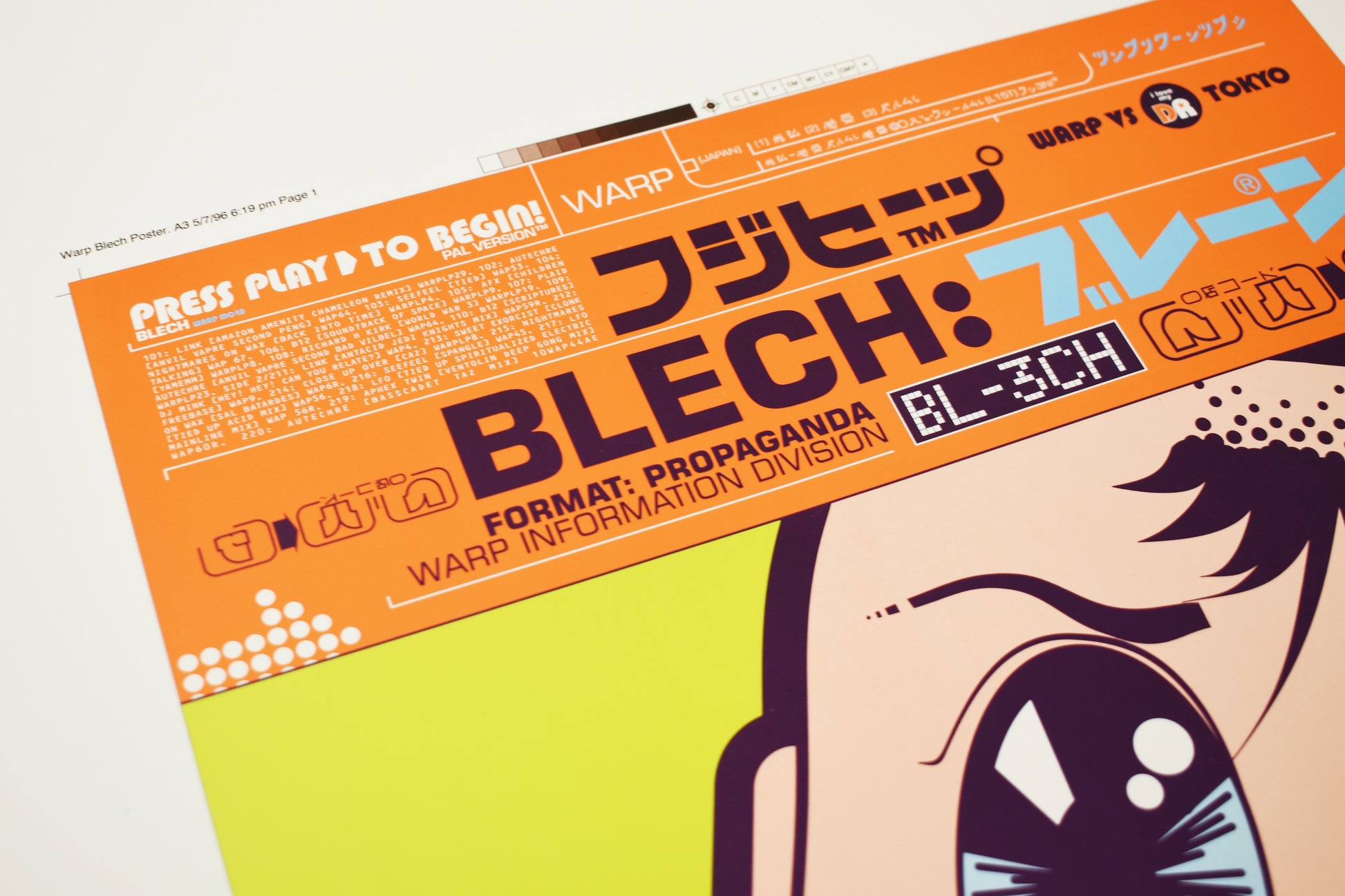 This is the poster of the Blech Warp Mixtape Cassette curated and mixed by DJ Food’s Mr Strictly (Kev) released in 1995 (an edited version with butchered sponsor-art came free with Wax Magazine in 1996). The poster was never used to promote the cassette. The design was re-created / repurposed as a 2m x 1m banner as part of a number of TDR shows and the edited down to A3 as part a Sonar (Barcelona) TDR (early ‘Peoples Bureau For Consumer Information’) sale.