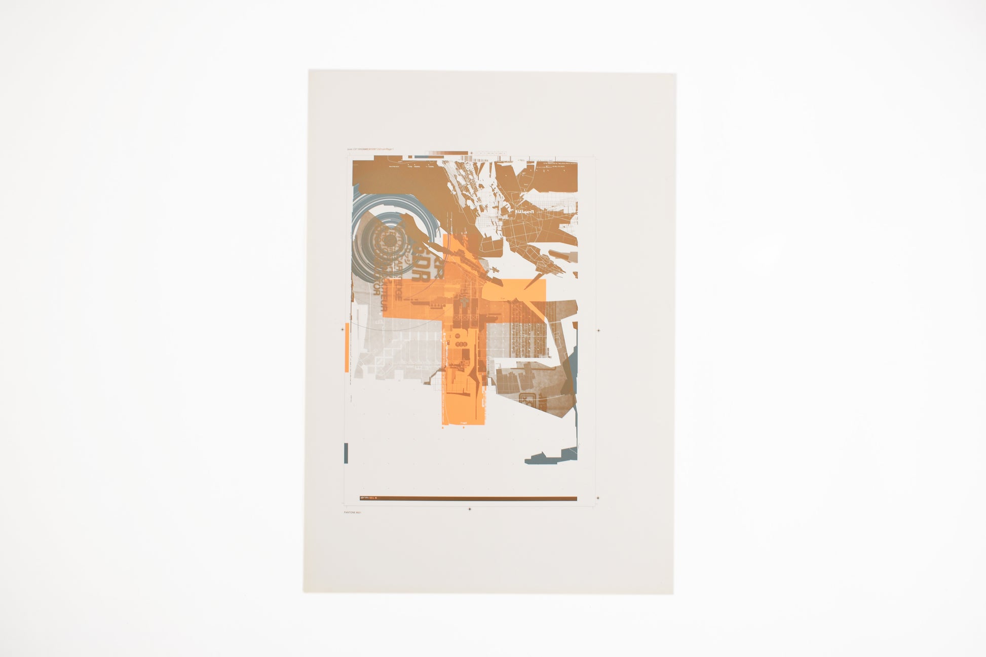 Set of 4 consecutive A2 printers proof test prints showing the build up of the layers, each a different colour starting with the fluorescent orange crucifix, overprinted with metallic green, then bronze and finally a silver overprint.